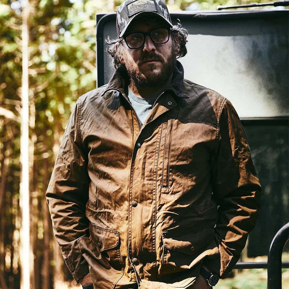 Brass zipper with storm flap closure to protect from wind 1 chest side-zip pocket, 2 flap pockets, 2 handwarmer pockets, 1 interior zipper pocket Snap-adjustable cuffs Drawcord waist for custom fit Accepts Filson zip-in liners Fully lined with cotton for comfort