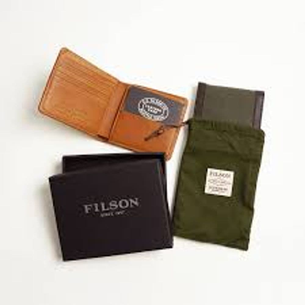 Weatherproof Leather is vegetable-tanned in Pennsylvania by Wickett & Craig Stitched with heavy-duty nylon thread for durability Twelve card slots and two hidden compartments Cash compartment has center divider for organization Debossed with Filson branding Dimensions: 4½"L x 4"W (closed)