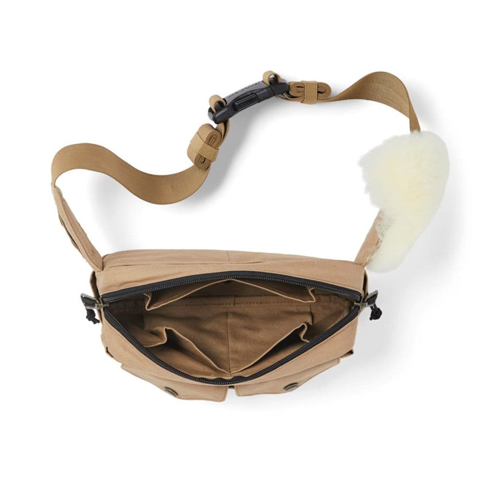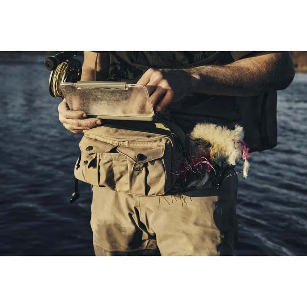 - Waist Strap Extends to 48" - 8-oz. 100% Cotton Dry Finish Shelter Cloth - Shearling Patch For Flies - Grommets on Pockets for Drainage - Ideal for Fishing Light and Fast DIMENSIONS 9-1/4”W x 5-1/4”H x 2-1/2”D MATERIAL 8-oz. 100% cotton dry finish Shelter Cloth + polyethylene